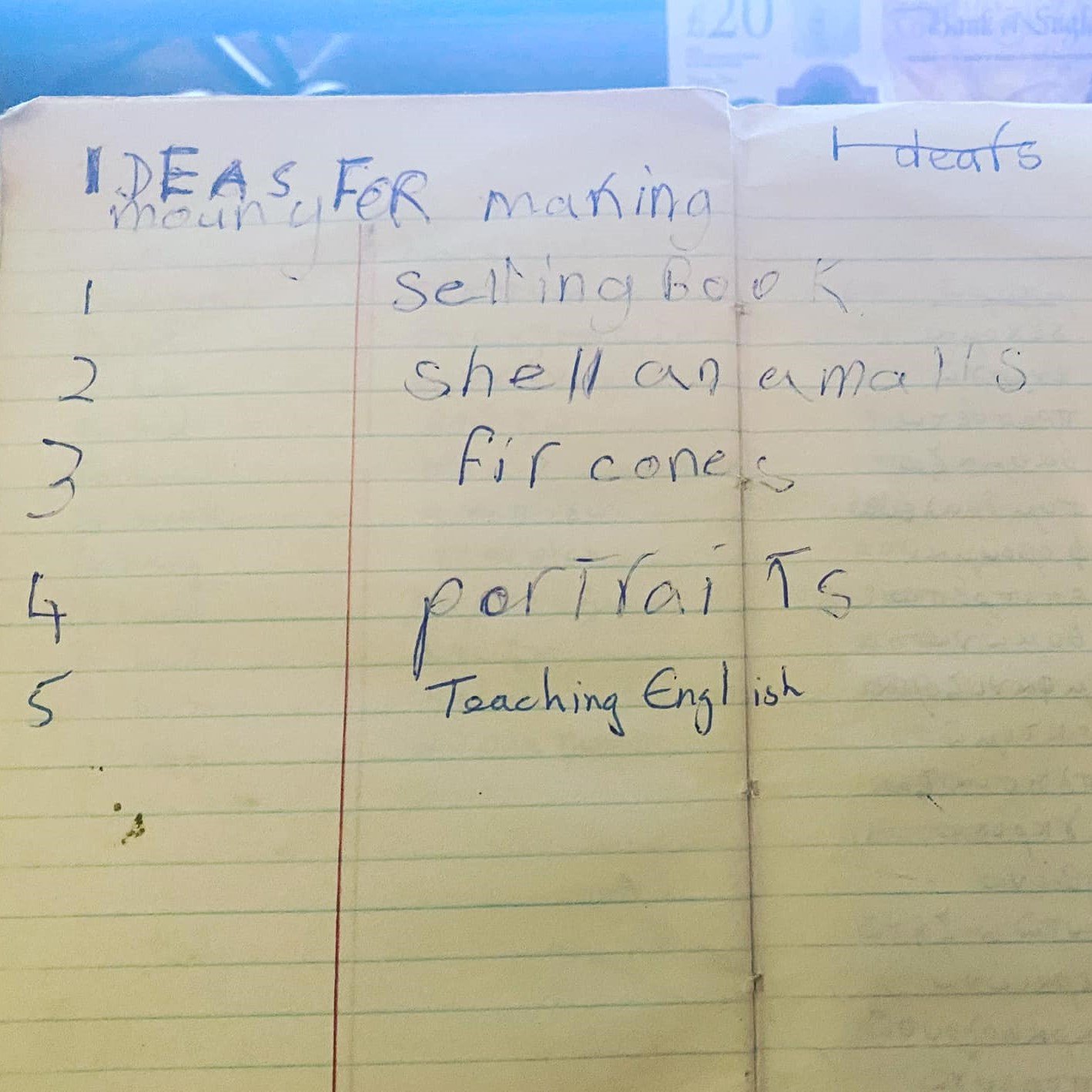 This photo is a diary page is from the time I was 7 and we were living in on a beach in Ibiza – it was during a “literally nothing” phase, we had run out of money and were brainstorming money-making ideas.