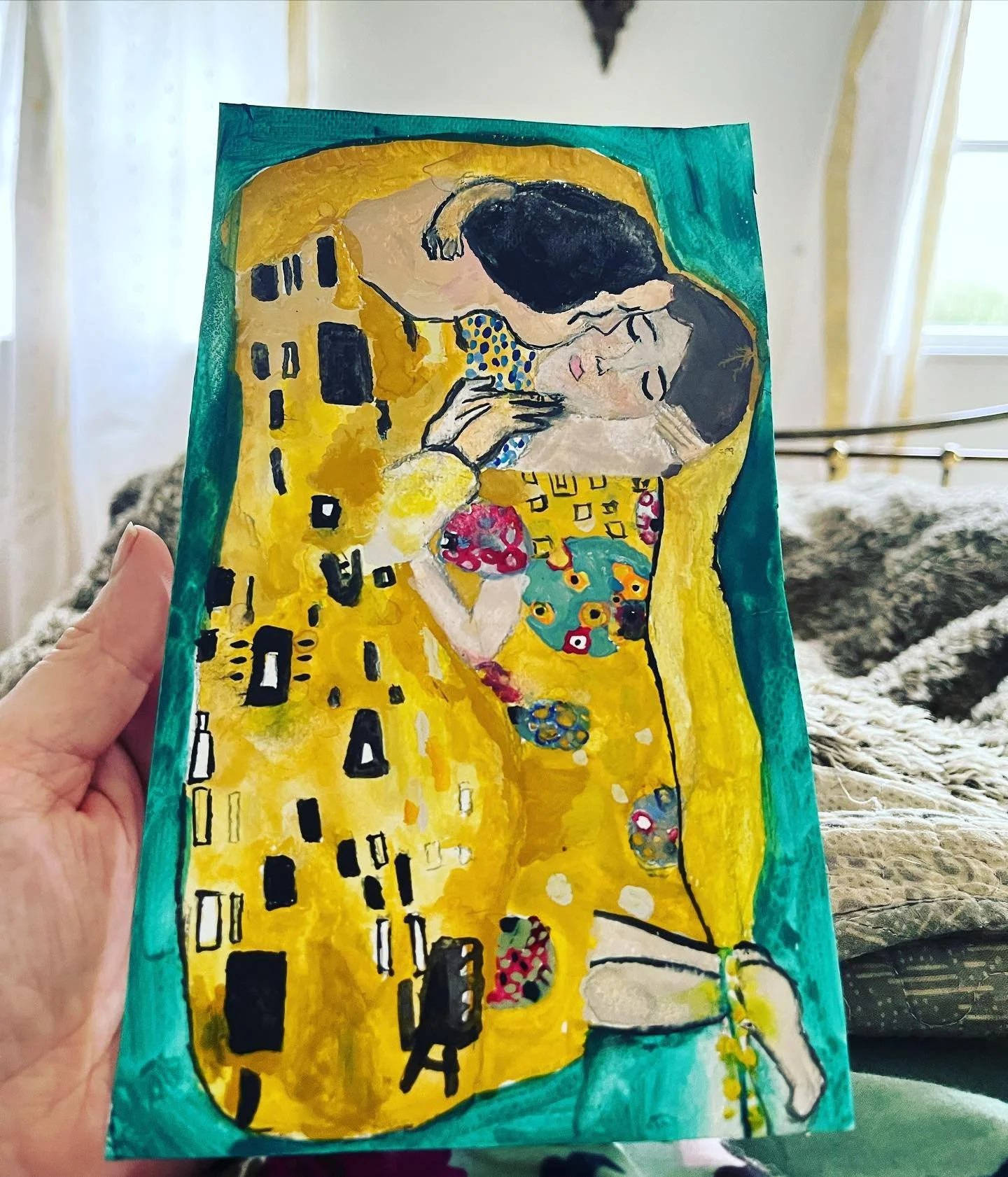 I’m lying in bed listening to my family downstairs making me breakfast in bed, and admiring my very own Klimt, painted by my daughter (when she discovered last week that he is one of my favourite artists, she secretly began painting this).