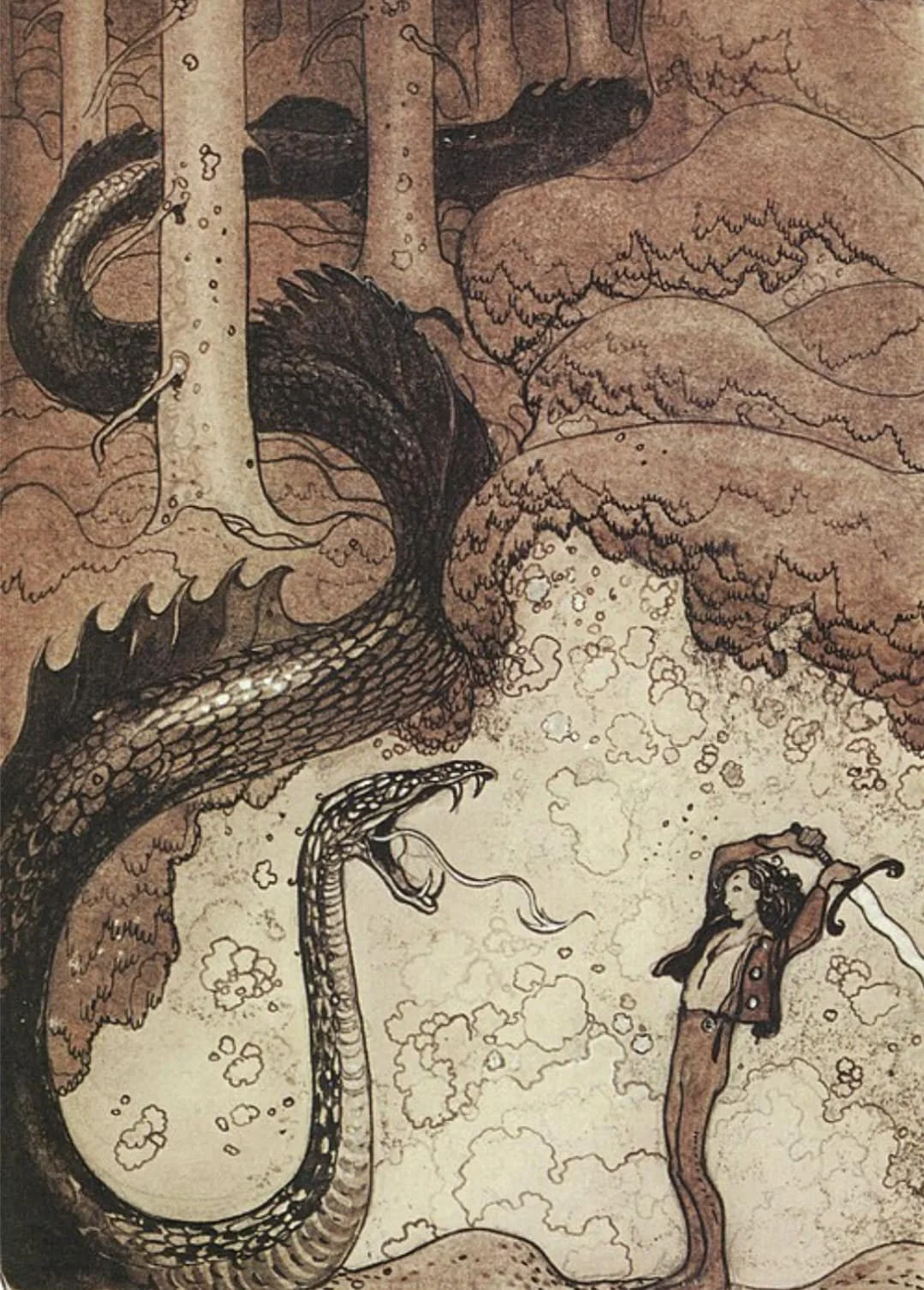 Swedish lindworm drawn by Swedish illustrator John Bauer, 1911.